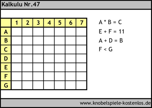 Die Zahlen 1,2,3,4,5,6 und 7 sollen den Buchstaben A,B,C,D,E,F und G zugeordnet werden. Bei der Lösung helfen Ihnen die Gleichungen und das Lösungsgitter.